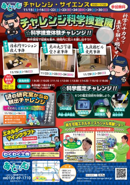11月15日(土)~30日(日)チャレンジ・サイエンスを開催!11月15日(土)~30日(日)の期間(平日を除く)は、 科学イベント「チャレンジ・サイエンス」を開催します。 イベントの参加・ご予約については注意事項がございますので こちらのお知らせをご覧ください。 11月イベント、 […] 11月15日~30日