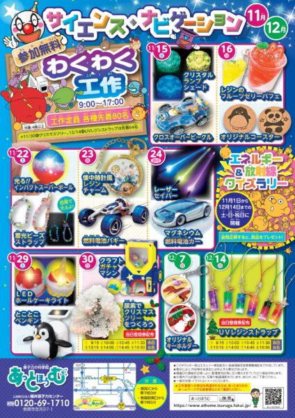 11月後半~12月の週末わくわく工作教室のお知らせ11月後半~12月の週末はわくわく工作教室を開催! 詳しくはチラシをご覧ください! イベントの参加・ご予約については注意事項がございますので こちらのお知らせをご覧ください。 11月イベント、工作教室参加方法のお知らせ 11月15日~12月14日