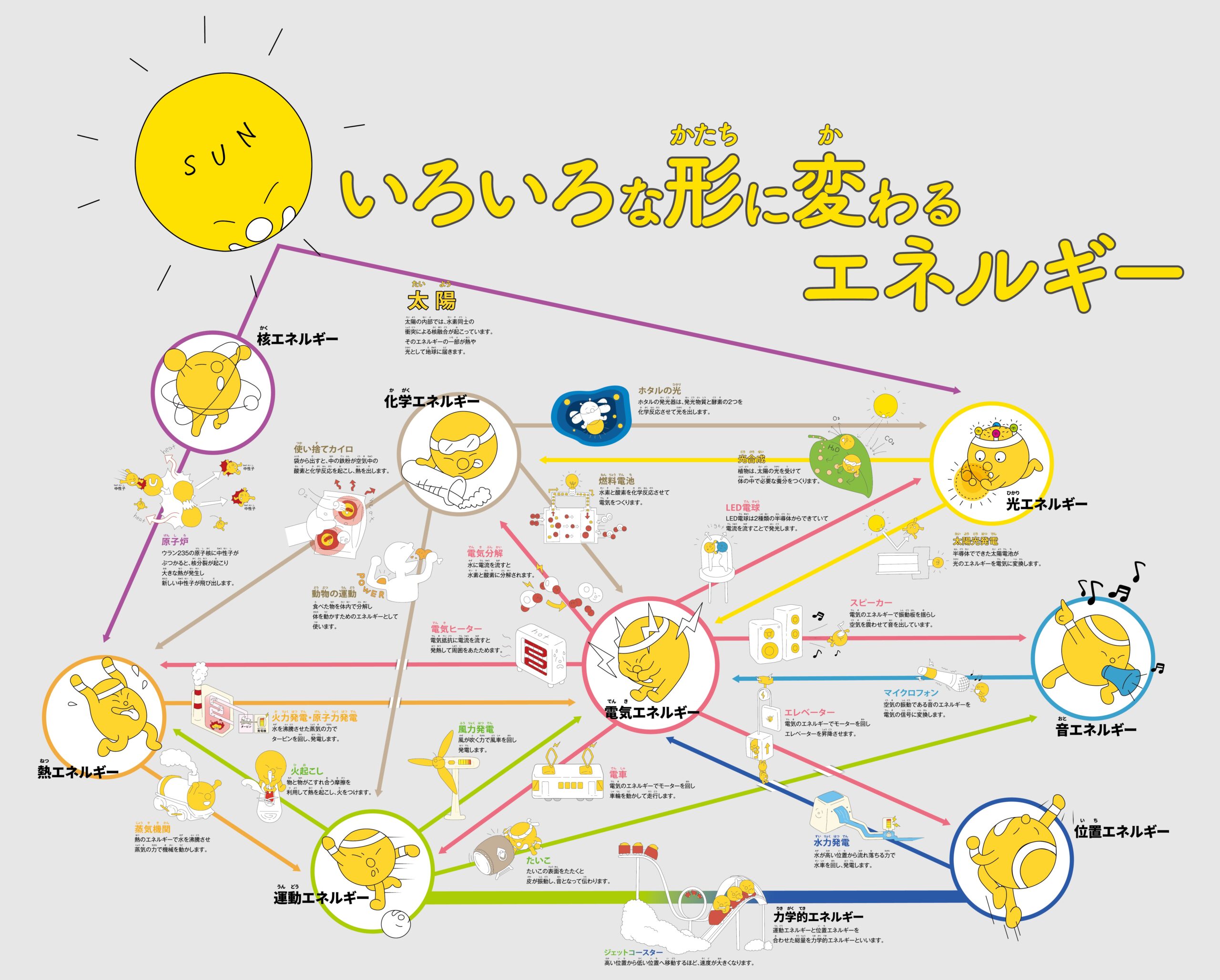 原子力発電、火力発電、再生可能エネルギーなど、さまざまな発電方法は、このエネルギーの変換を上手に利用しているんだよ。